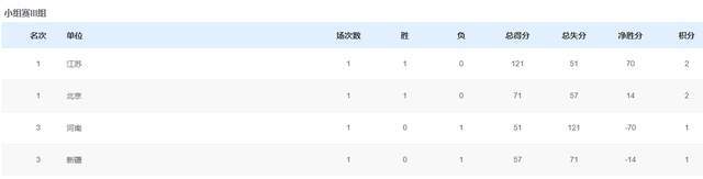 第十五屆全運會女籃成年組比賽正式開打。隨著江蘇女籃121比71擊敗河南隊,北京隊71比57戰勝新疆隊,第一比賽日的6場比賽全部結束,3個小組的積分榜也就出爐瞭。三大奪冠熱門四川女籃首秀就贏瞭98分,可謂獨一檔的存在。江蘇隊緊隨其後,狂贏70分。廣東隊隻贏瞭48分。